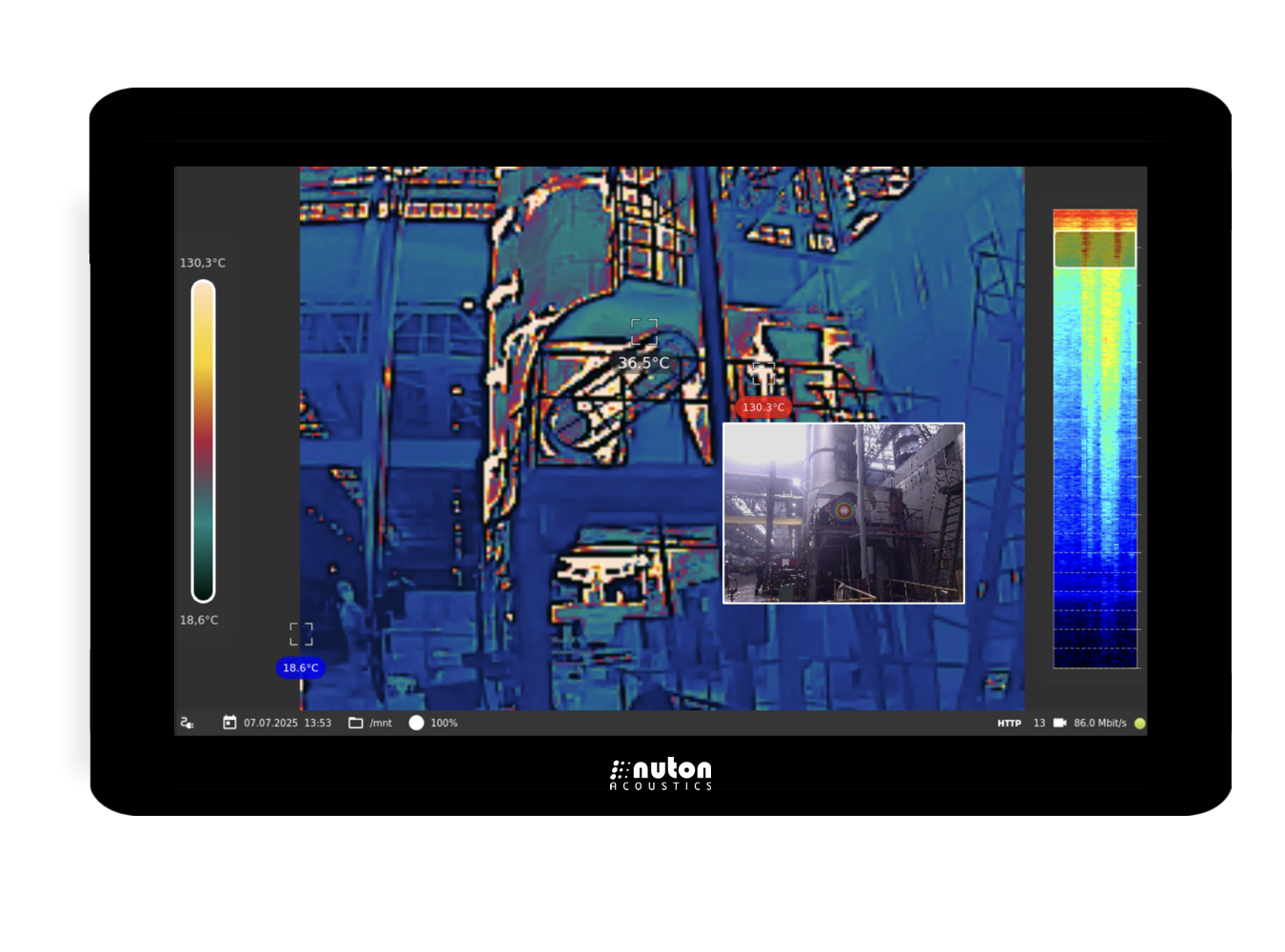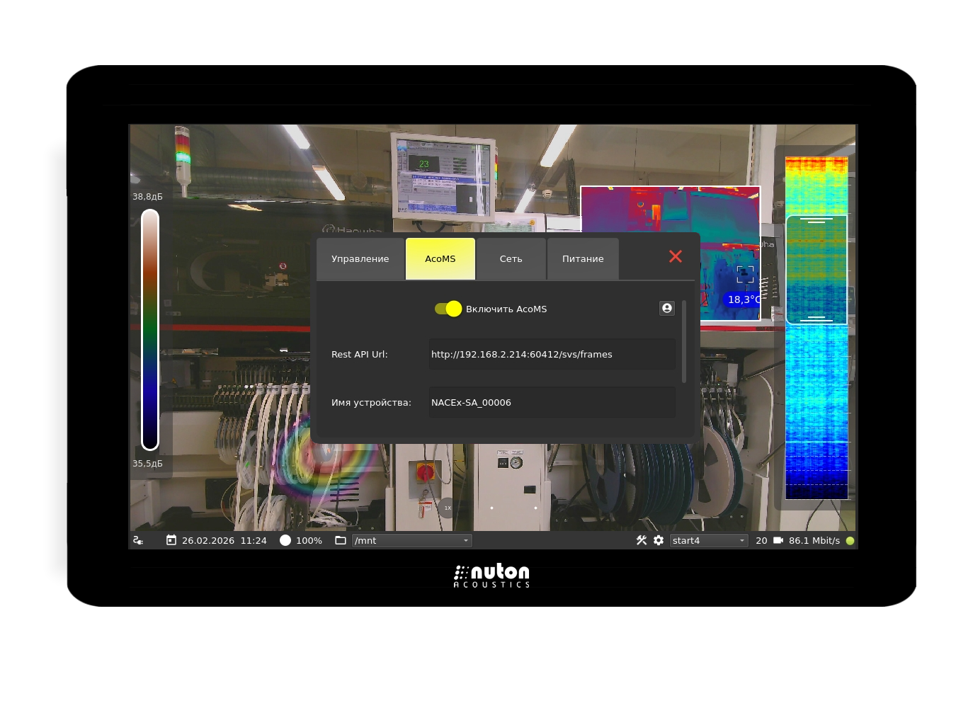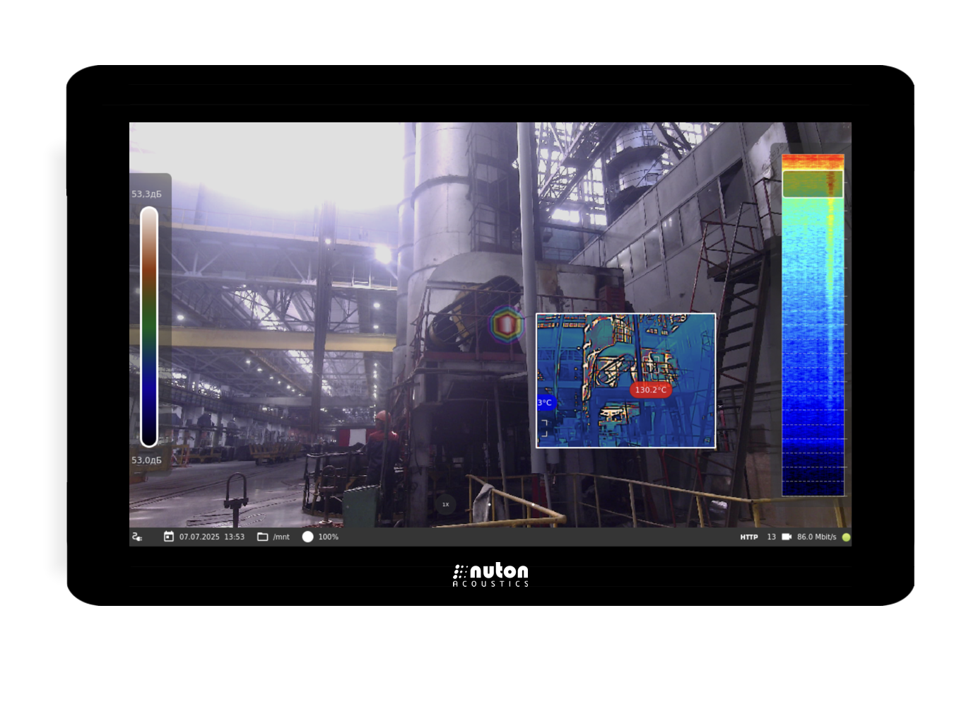 Designed for stationary installation in explosive zones of classes 1, 2, 21 and 22 for the purpose of continuous non-contact monitoring of the condition of technical equipment by measuring the sound pressure level of acoustic noise, operational video surveillance, thermal imaging (version with a thermal imaging module) and real-time visualization of the acoustic field in the sound frequency range resulting from defects in mechanical equipment